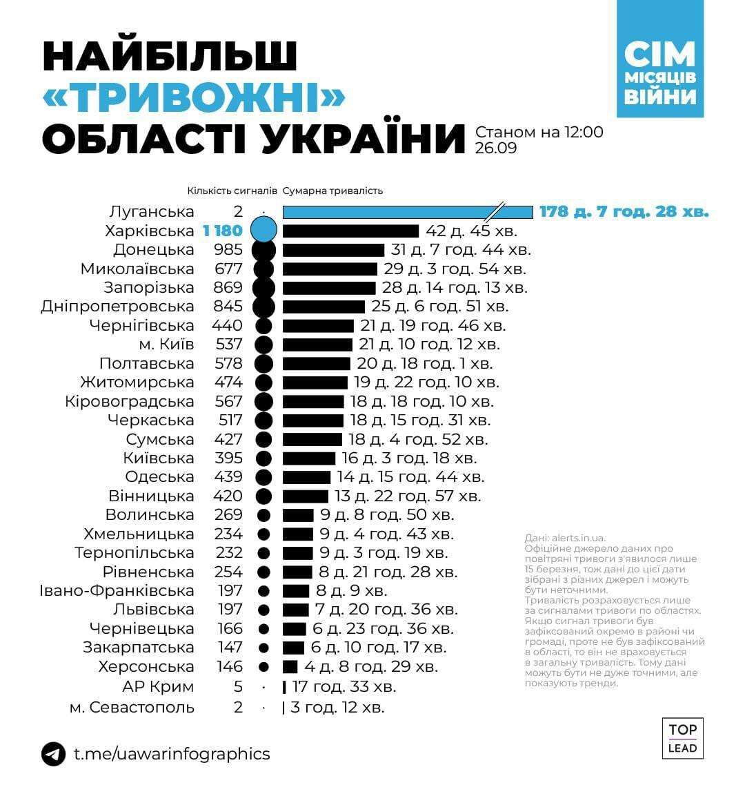 В составленном рейтинге Днепропетровская область заняла 6-е место с показателем 845 сирен по состоянию на 12:00 26 сентября. Суммарная длительность их составила 25 дней и 6 часов.