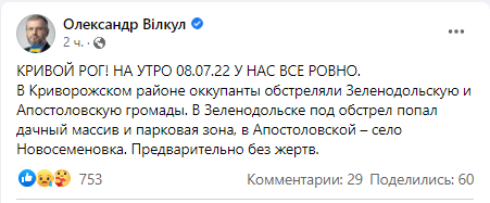 "В Зеленодольске под обстрел попал дачный массив и парковая зона, в Апостоловской – село Новосеменовка. Предварительно, без жертв", - написал Александр Вилкул.