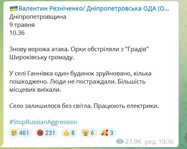 Об этом в своем телеграмм-канале рассказал глава ДнепропетровскойОВА Валентин Резниченко.