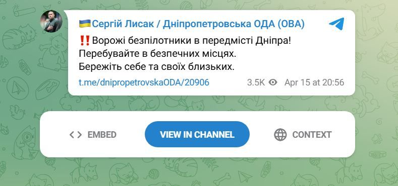 Вражеские беспилотники в пригороде Днепра! Находитесь в безопасных местах. Берегите себя и своих близких, — написал Лисак.