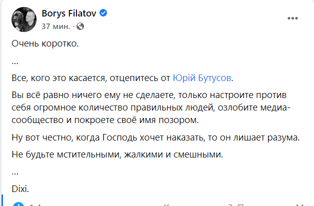 "Очень коротко. Все, кого это касается, отцепитесь от Юрия Бутусова. Вы всё равно ничего ему не сделаете, только настроите против себя огромное количество правильных людей, озлобите медиасообщество и покроете своё имя позором. Ну вот честно, когда Господь хочет наказать, то он лишает разума. Не будьте мстительными, жалкими и смешными", - написал Борис Филатов.