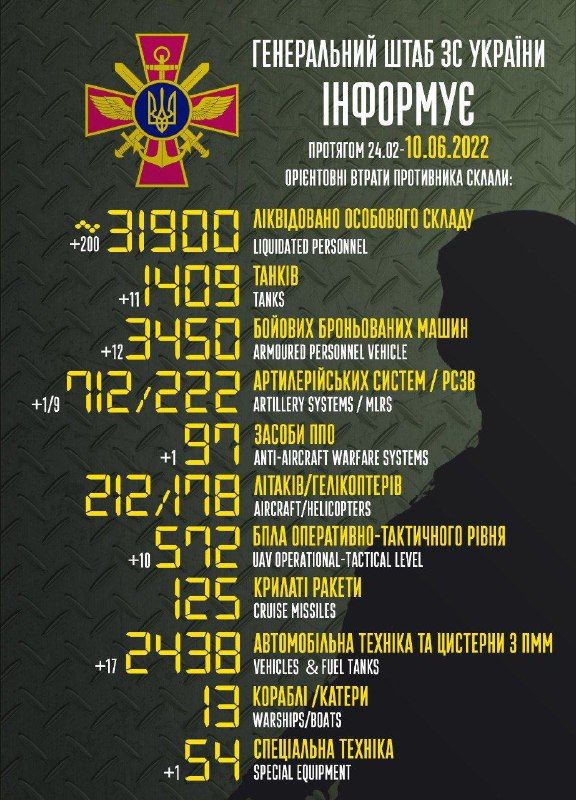 Общие боевые потери противника с 24.02 по 10.06 ориентировочно составили: