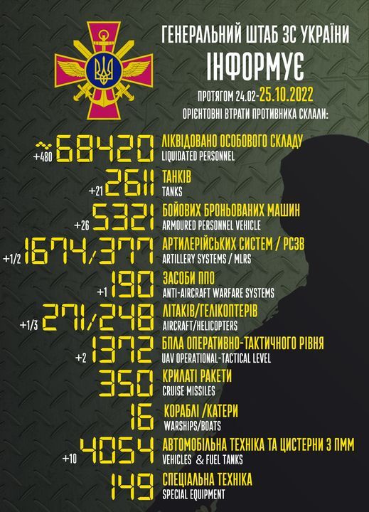 Общие боевые потери противника с 24.02 по 25.10 ориентировочно составили:
