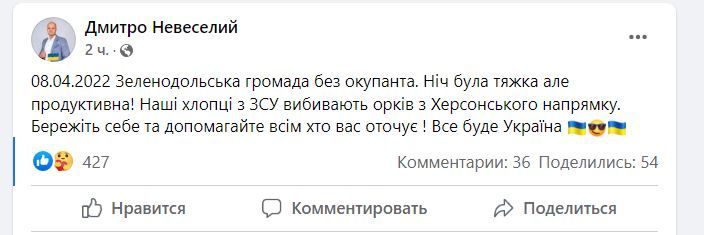 По его словам, на территории Зеленодольской громады оккупантов нет. Ночь была тяжелой, но продуктивной. ВСУ активно выбивают оккупантов из Херсонского направления. Также он просит беречь себя и заботиться о тех, кто рядом.