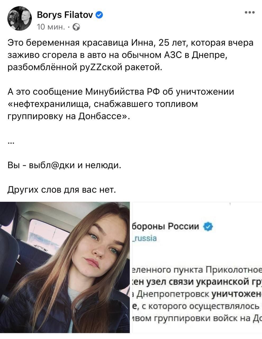Это беременная красавица Инна, 25 лет, которая вчера заживо сгорела в авто на обычном АЗС в Днепре, разбомблённой руZZской ракетой. А это сообщение Минубийства РФ об уничтожении «нефтехранилища, снабжавшего топливом группировку на Донбассе». Вы - выбл@дки и нелюди. Других слов для вас нет, - отметил Филатов.