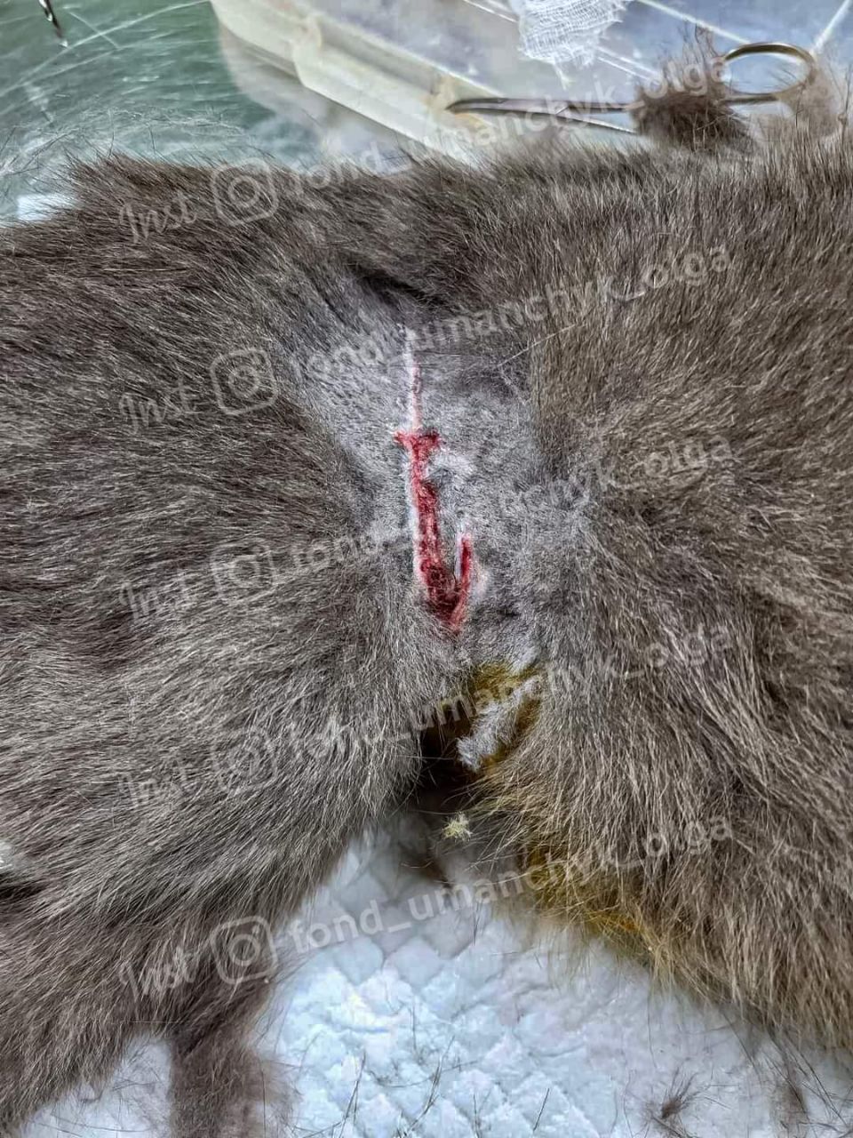Сколько времени кошка пробыла связанной - неизвестно, но леска оставила глубокие порезы, которые загноились. Больше всего пострадала задняя лапа. В ране видны кости и сухожилия, которые чудом не перерезала тонкая провололка.