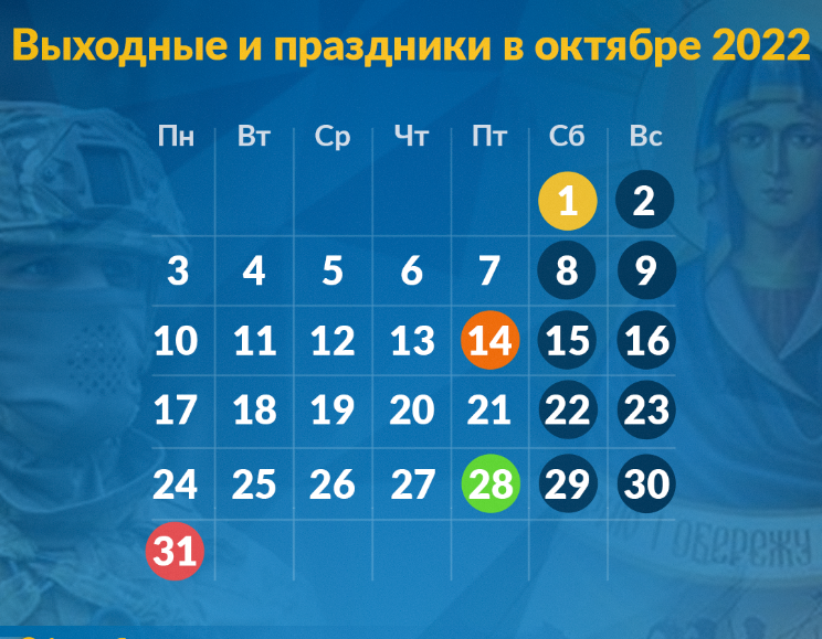 Это субботы и воскресенья – 1, 2, 8, 9, 15, 16, 22, 23, 29 и 30 октября. Выходного на День защитников и защитниц Украины 14 октября не будет из-за военного положения. Такое решение Верховная Рада утвердила 15 марта, приняв соответствующий закон. Он отменяет выходные на государственные праздники, их перенос, если праздник приходится на рабочий день. Также не предусматривает сокращение рабочего дня на 1 час в день, предшествующий празднику.
