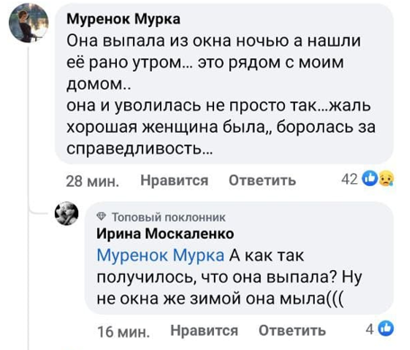 В соцсетях соседи женщины отмечают, что не верят в версию про самоубийство. Ее смерть они связывают с ее профессиональной деятельностью.