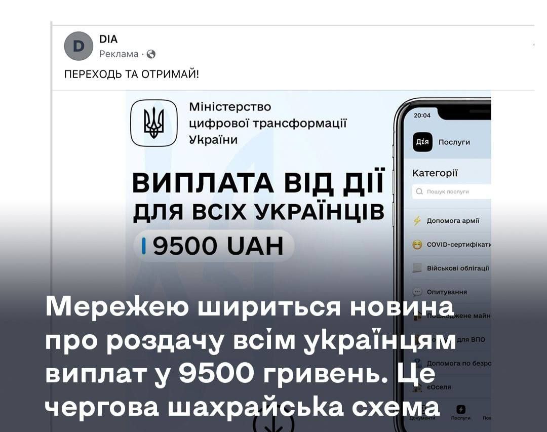 "Выплата 9500 грн от Дії для всех украинцев": в сети распространяют новый фейк