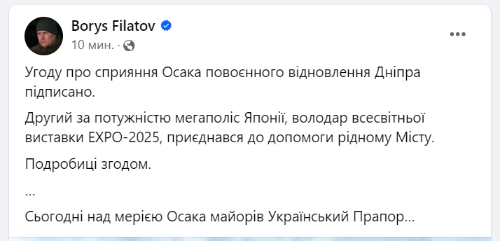 Соглашение о содействии Осака послевоенному восстановлению Днепра подписано. Второй по мощности мегаполис Японии, обладатель всемирной выставки EXPO-2025, присоединился к помощи родному Городу. Подробности позже, - написал он.