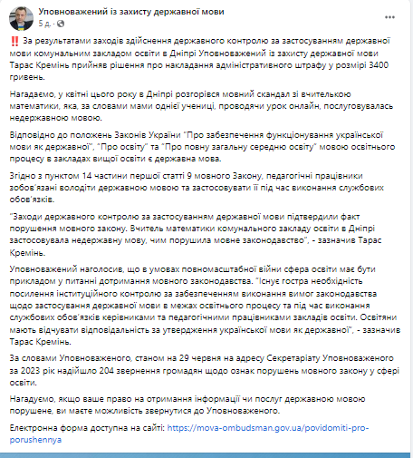 По его словам, по результатам государственного контроля подтвержден факт нарушения: учитель математики коммунального учебного заведения в Днепре применяла негосударственный язык, чем нарушила языковое законодательство. На преподавательницу наложили штраф в размере 3400 гривен.