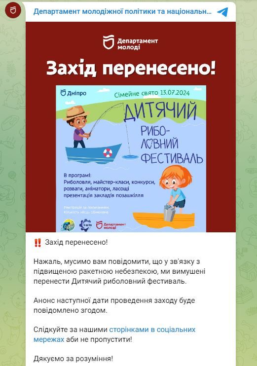 К сожалению, мы должны сообщить, что в связи с повышенной ракетной опасностью, мы вынуждены перенести Детский рыболовный фестиваль. Анонс следующей даты проведения мероприятия будет сообщен впоследствии, - говорится в сообщении.