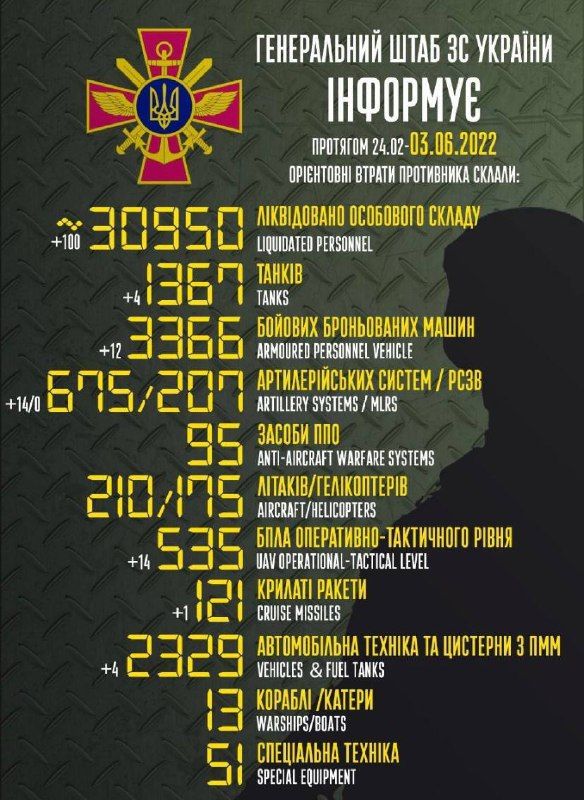 Общие боевые потери противника с 24.02 по 03.06 ориентировочно составили: