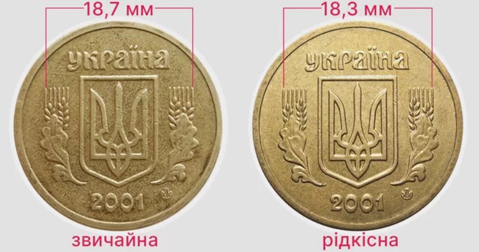 У обычной монеты – 18,7 мм, а у редкой на четыре меньше – 18,3 мм.