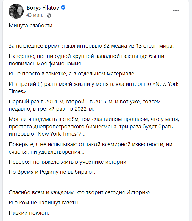 "За последнее время я дал интервью 32 медиа из 13 стран мира. Наверное, нет ни одной крупной западной газеты, где бы ни появилась моя физиономия. И не просто в заметке, а в отдельном материале. И в третий (!) раз в моей жизни у меня взяла интервью «New York Times». Первый раз в 2014-м, второй - в 2015-м, и вот уже, совсем недавно, в третий раз - в 2022-м. Мог ли я подумать в своём, том счастливом прошлом, что у меня, простого днепропетровского бизнесмена, три раза будет брать интервью “New York Times”?" - написал мэр Днепра.