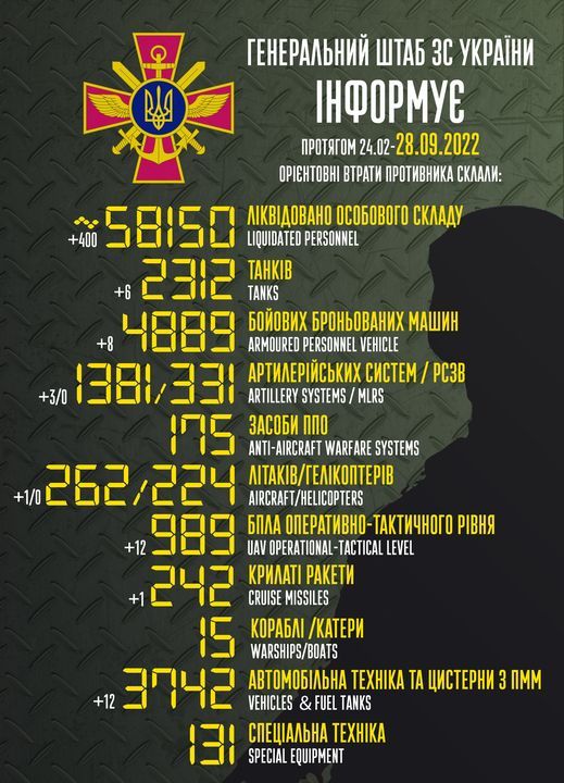 Общие боевые потери противника с 24.02 по 28.09 ориентировочно составили: