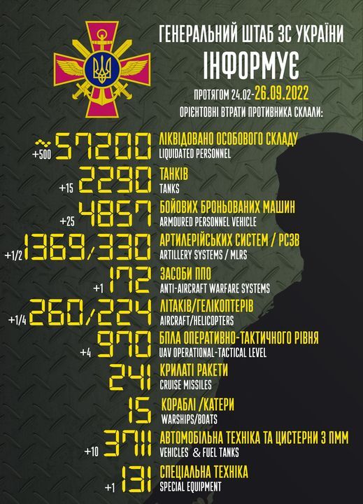 Так, по состоянию на 26 сентября наши защитники уничтожили уже 57200 оккупантов. Только за минувшие сутки 500 россиян отправились на "концерт Кобзона".