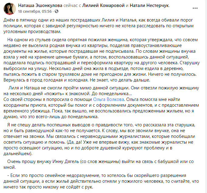 По словам бабушки, ее внучка взяла у нее на хранение ценные бумаги, а потом подделала ее подпись и переоформила квартиру на другого человека. После чего пенсионерка вынуждена была уехать в деревню и жить в старом трухлявом доме. Сейчас женщину приютили знакомые активистки, а дальше помогут связаться с приютом и найти временное жилье.