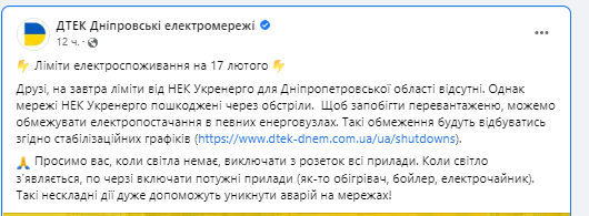 Сегодня, 17 февраля, в Днепре и области не планируют выключать свет. Ведь сегодня лимиты от НЭК “Укрэнерго” для Днепропетровской области отсутствуют.
