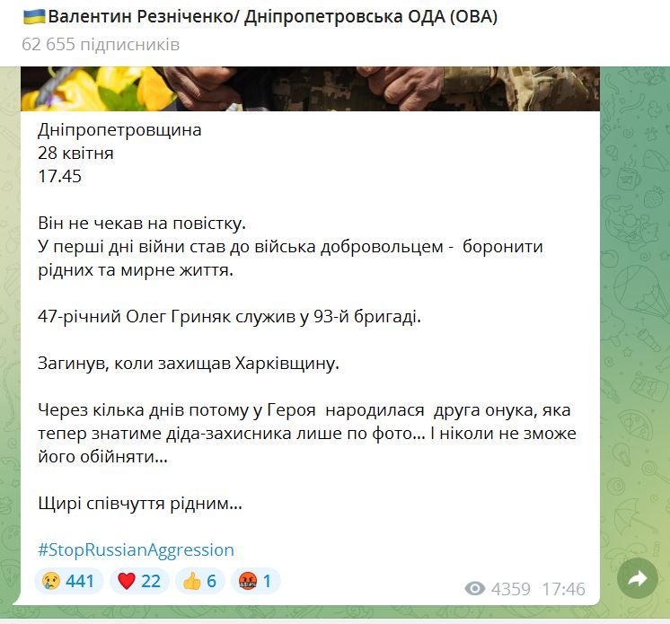 Известно, что Олегу Гриняку было 47 лет. Служил он в 93-й бригаде Холодный яр и защищал Харьковщину. Мужчина не ждал повестку, а одним из первых пошел защищать нашу страну. Через несколько дней после его гибели, у него родилась вторая внучка, которая теперь сможет увидеть своего дедушку только на фото.
