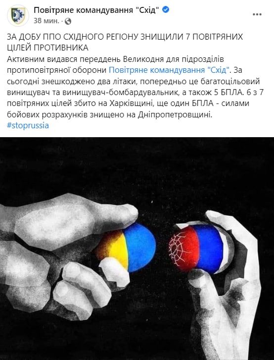 Південне командування «Схід» повідомляє, що сьогодні збито два літаки та 5 БПЛА. Попередньо це багатоцільовий винищувач та винищувач-бомбардувальник. 6 з 7 повітряних цілей збито на Харківщині, ще один БПЛА - силами бойових розрахунків знищено на Дніпропетровщині.