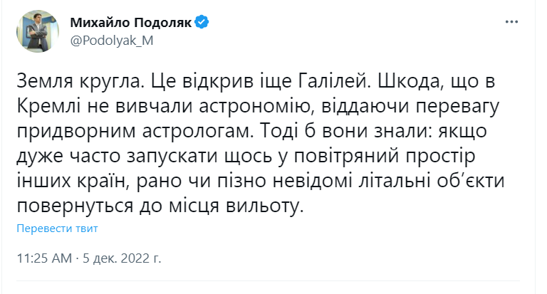 Жаль, что в Кремле не изучали астрономию, предпочитая придворных астрологов. Тогда они бы знали: если очень часто запускать что-то в воздушное пространство других стран, рано или поздно неизвестные летательные объекты вернутся к месту вылета, – отметил Подоляк.