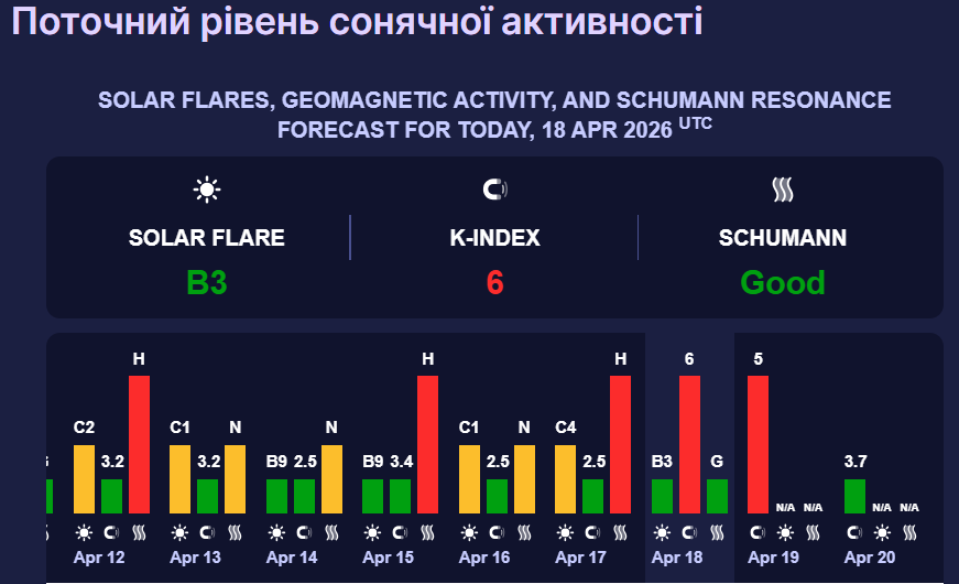 Сегодня ожидается солнечная активность с К-индексом 6 (красный уровень), что соответствует сильным магнитным бурям.