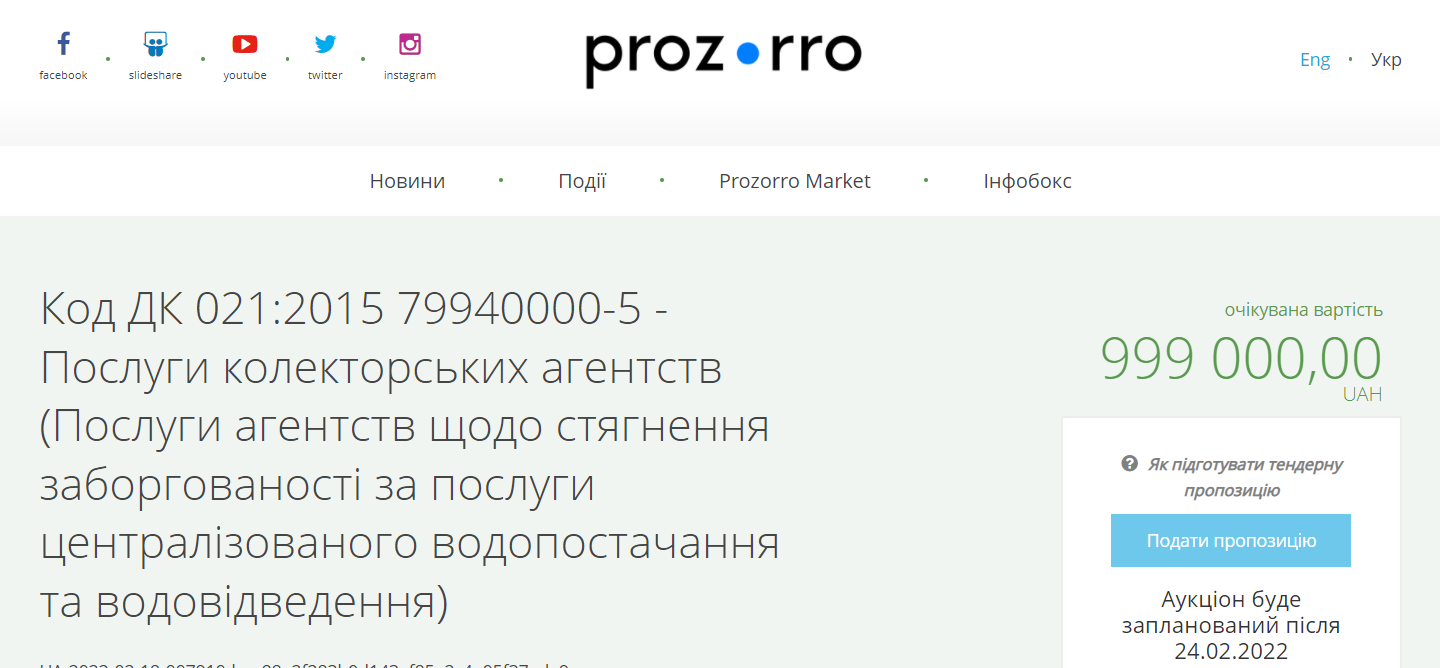КП «Днепрводоканал» опубликовал закупку по поиску коллекторского агентства.