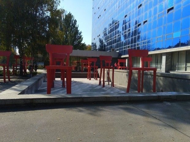 У главного корпуса ДНУ им. О. Гончара установлена инсталляция из 17 стульев разной высоты. Арт-объект появился возле вуза в 2018 году, в честь 100 –летнего юбилея учреждения. Называется он «Лекторий». На каждом стуле есть символическая надпись: «мер Днепра», «Президент Украины», «олимпийский чемпион». Все они говорят о достижениях выпускников учебного заведения. Автор композиции – художник из Днепра Никита Шалений. Любопытно, что каждый может залезть даже на самый высокий стул и сделать на нем фото. Все – благодаря секретному механизму в ножках.
