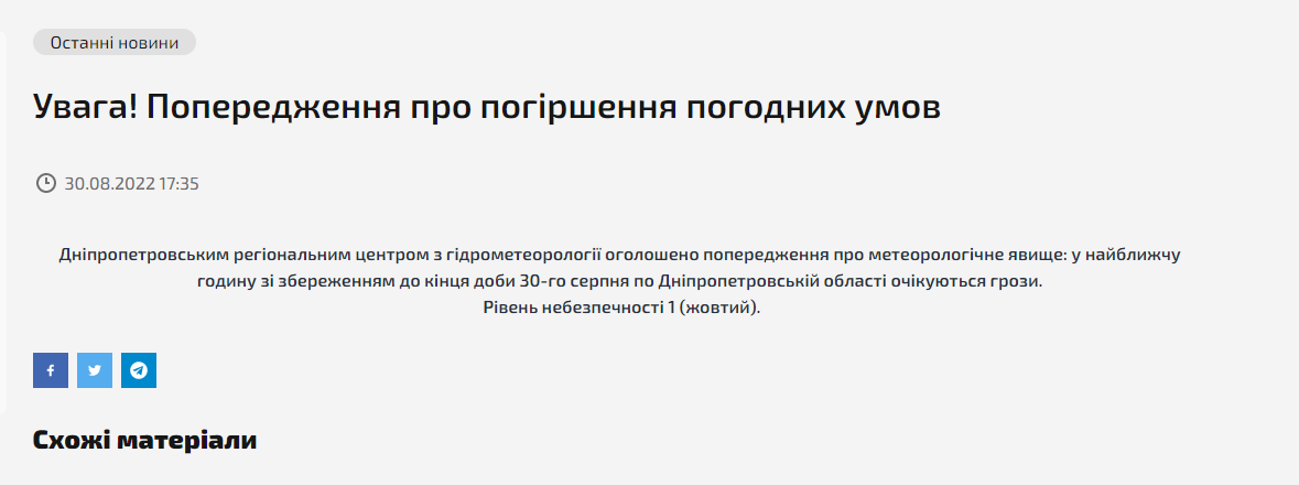 Синоптики Днепропетровского регионального центра по гидрометеорологии объявили предупреждение о метеорологическом явлении: в ближайшее время с сохранением до конца суток 30 августа по Днепропетровской области ожидаются грозы.