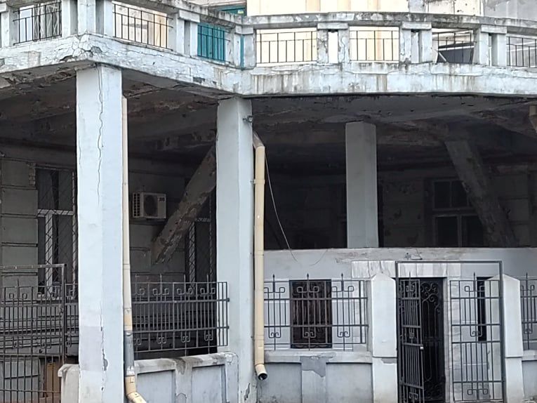 Вид перилл и балкона кричит о необходимости ремонта. На стенах есть трещины. Кое-где видна строительная арматура – она торчит со стен.