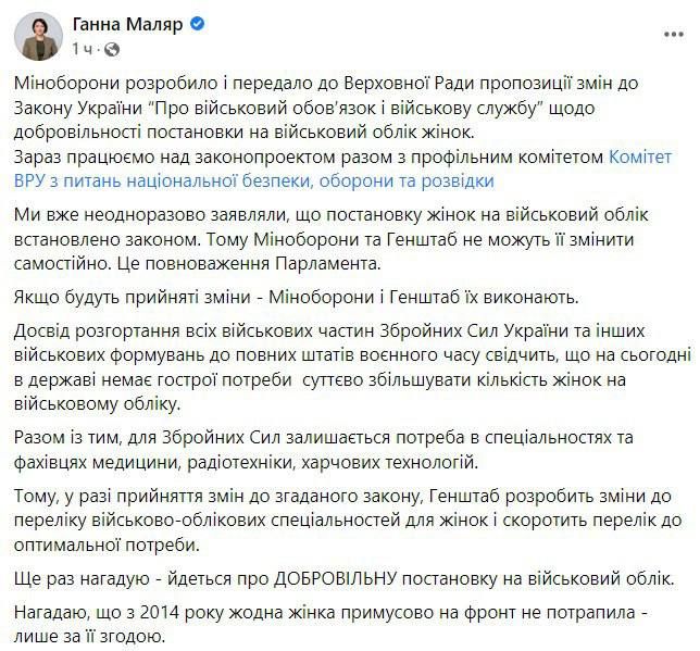 Если будут приняты изменения - Минобороны и Генштаб их выполнят. Опыт развертывания всех военных частей Вооруженных Сил Украины и других военных формирований до полных штатов военного времени свидетельствует, что на сегодня в государстве нет острой необходимости существенно увеличивать количество женщин на воинском учете. Вместе с тем, для Вооруженных Сил остается потребность в специальностях и специалистах медицины, радиотехники, пищевых технологий. Поэтому, в случае принятия изменений в упомянутый закон, Генштаб разработает изменения в перечне военно-учетных специальностей для женщин и сократит перечень к оптимальной потребности, - подчеркнула Маляр.