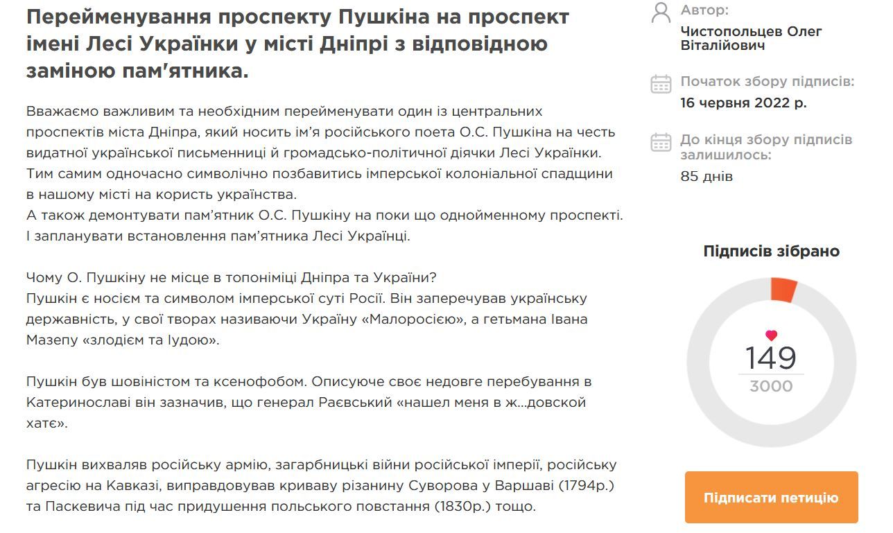 Автор петиции Олег Чистопольцев предлагает также демонтировать памятник Пушкину на этом проспекте, а на его месте поставить монумент в честь Леси Украинки. Петицию подписали уже 149 человек из 3000 тысяч необходимых.