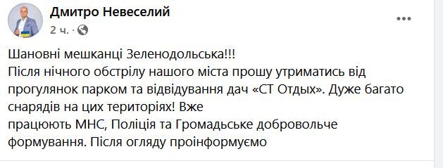 Об этом на своей странице в Фейсбуке сообщил Зеленодольский городской голова Дмитрий Невеселый.