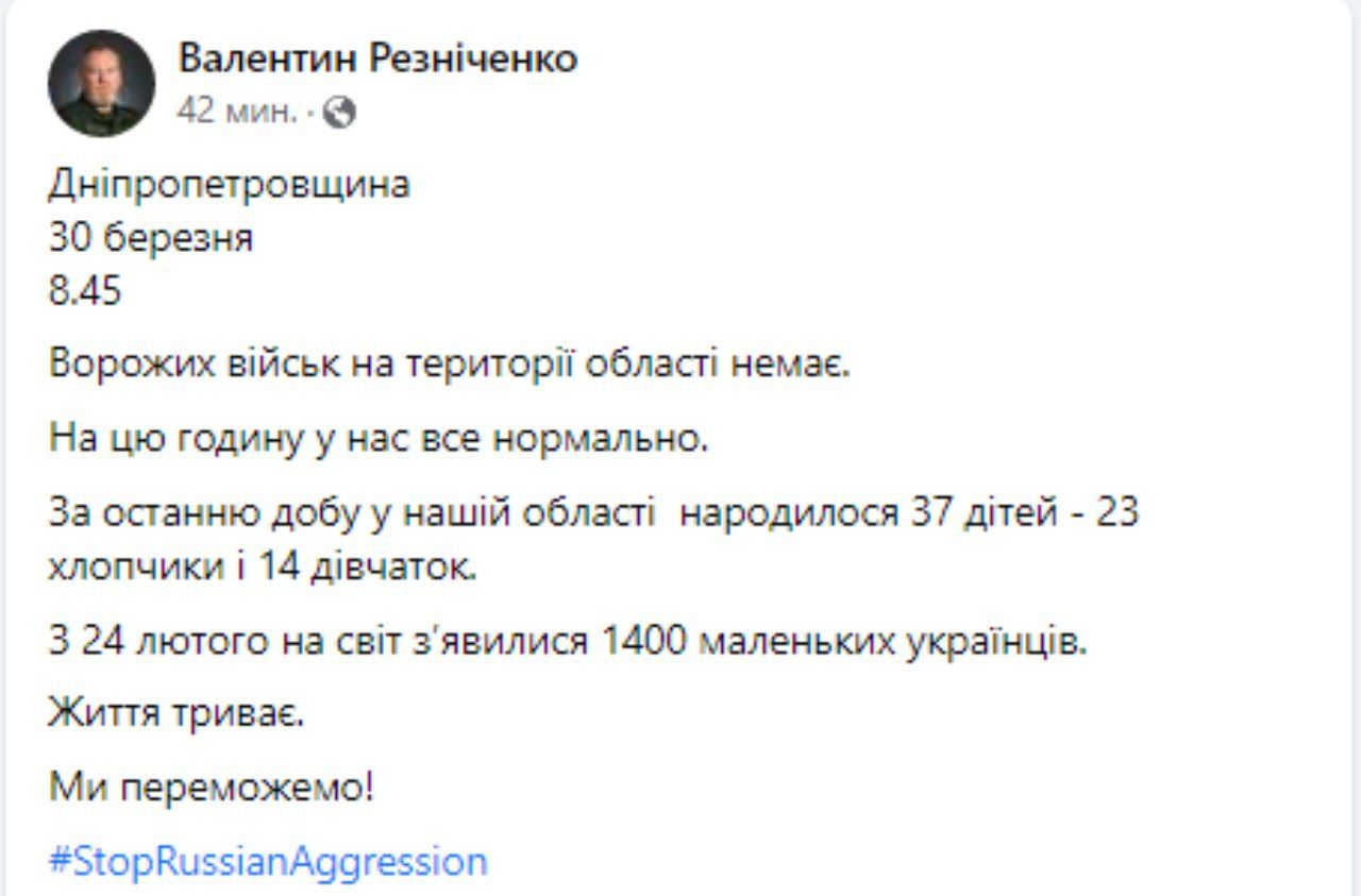 «Вражеских войск на территории области нет. На данный момент у нас все нормально. За последние сутки в нашей области родились 37 детей – 23 мальчика и 14 девочек. С 24 февраля на свет появились 1400 маленьких украинцев. Жизнь продолжается. Мы победим», — написал Валентин Резниченко.