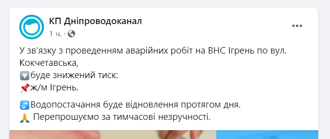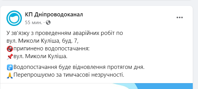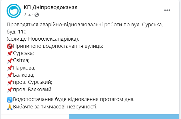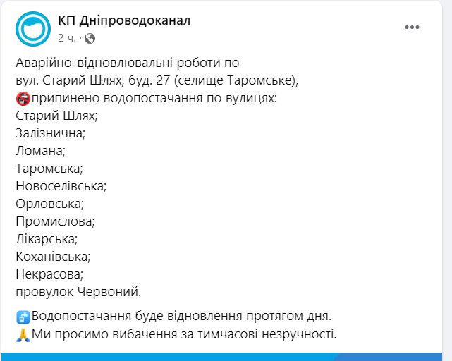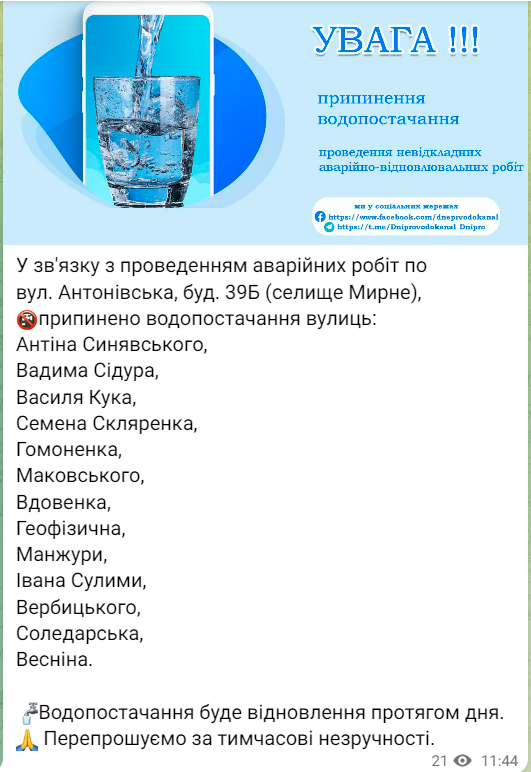 Сегодня, 2 июня, в Днепре и Днепровском районе некоторые жители остались без воды.