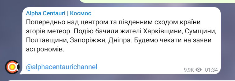 Предварительно, над центром и юго-востоком страны сгорел метеор. Событие видели жители Харьковщины, Сумщины, Полтавщины, Запорожья, Днепра. Будем ждать заявления астрономов, - говорится в сообщении.