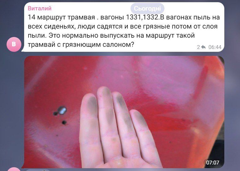 14 маршрут трамвая. В вагонах пыль на всех сиденьях, люди садятся и все грязные потом от слоя пыли. Это нормально, выпускать на маршрут такой трамвай с грязным салоном? - написал днепрянин Виталий.