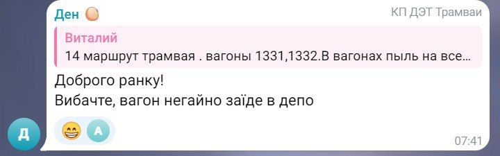 Представитель КП "Днепровский электротранспорт" отреагировал на жалобу и отметил, что "вагон немедленно заедет в депо".