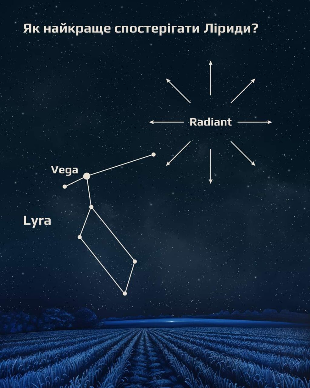 Ночь против 23 апреля — лучшая возможность полюбоваться ежегодным весенним метеорным потоком Лириды, ведь именно на эту дату приходится его пик, сообщают на Facebook-странице Planetarium Noosphere Dnipro.