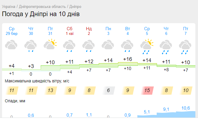 Облачная погода, температура воздуха +2-5 градусов и снег в придачу – такое утро выдалось у жителей Днепра сегодня, 29 марта.