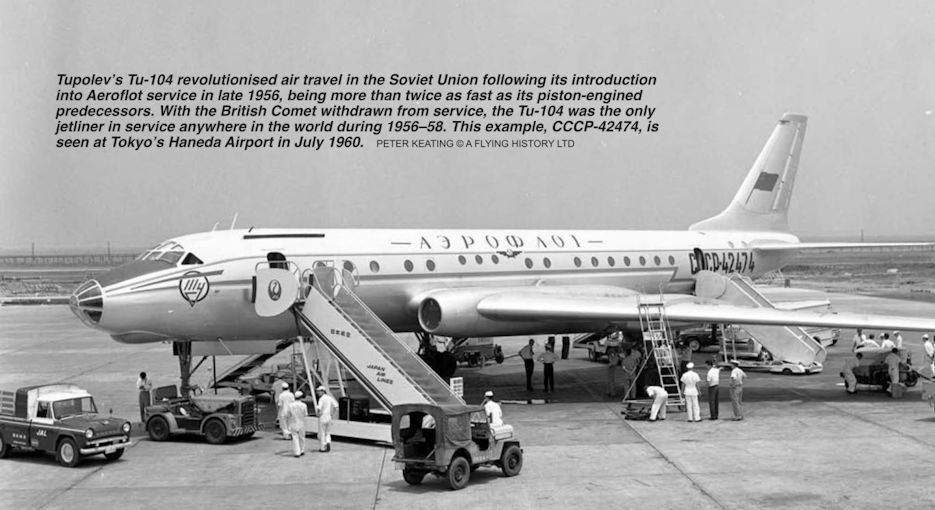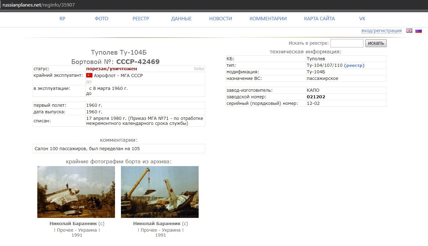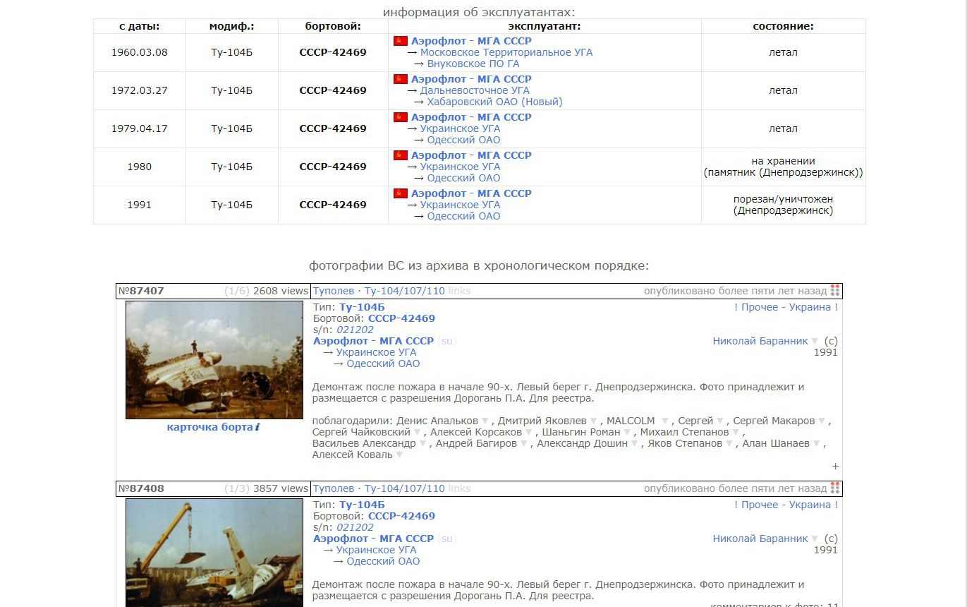 К началу 1977 года в приписном парке Аэрофлота работало чуть более 70 из 200 построенных для СССР Ту-104 всех модификаций. С 1977 года список владельцев 104-к стал стремительно сокращаться. В июле 1977 года эксплуатацию Ту-104 прекратило Бориспольское ПО частично списав, а частично передав свои машины в Одессу».***