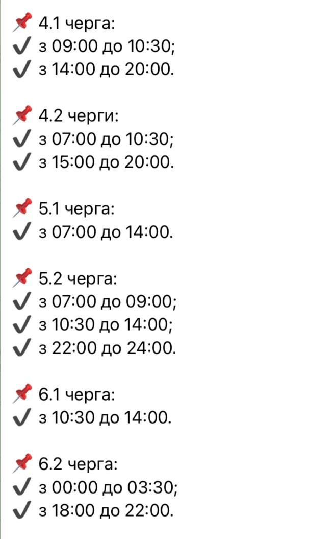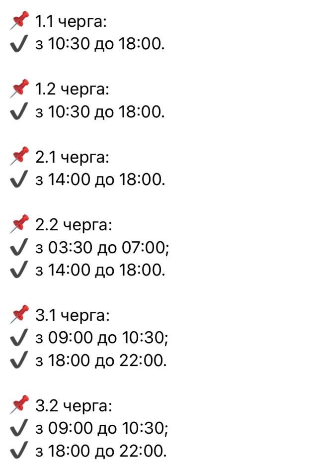 Графіки погодинних відключень будуть застосовувати з 00:00 до 23:59 - від 0,5 до 3 черг (з максимальним обсягом обмежень у вечірні години). Разом з цим будуть задіяні графіки обмеження потужності для промислових споживачів - з 00:00 до 23:59.