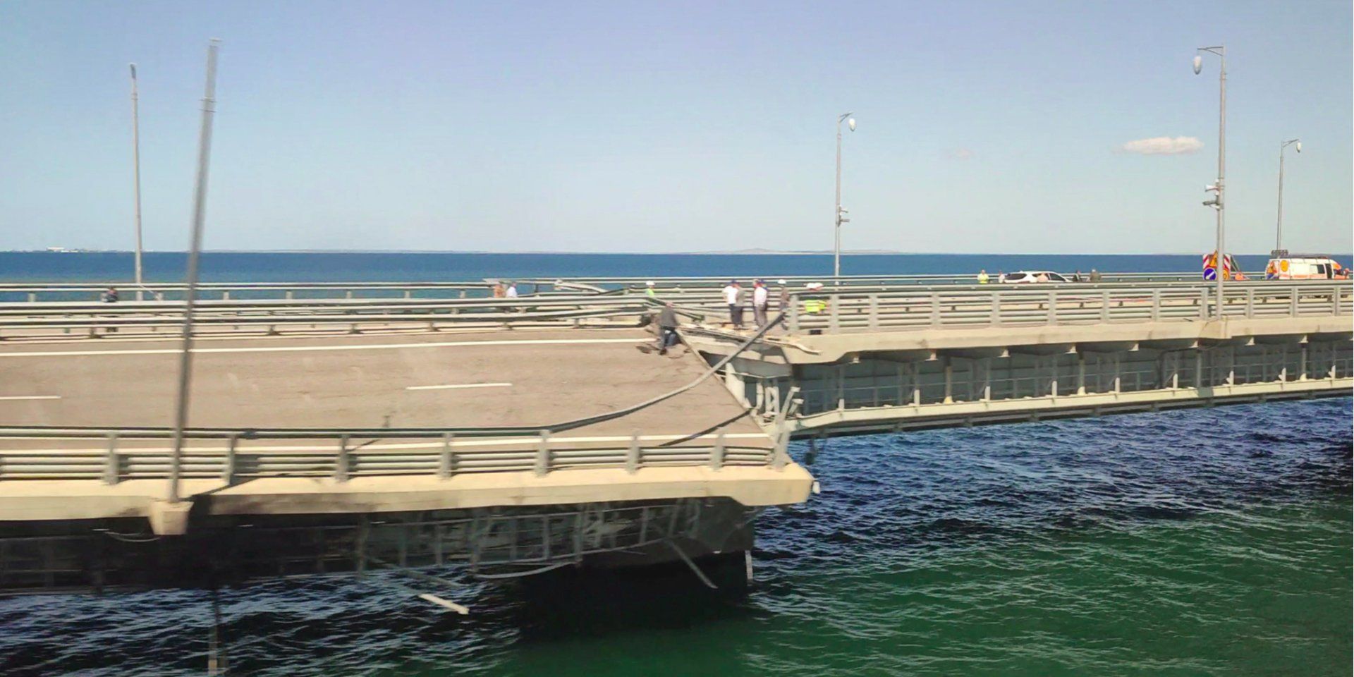 У ніч проти 17 липня Україна вдарила по опорах кримського мосту надводними дронами. Було пошкоджено автодорожній проліт та залізничну частину мосту.