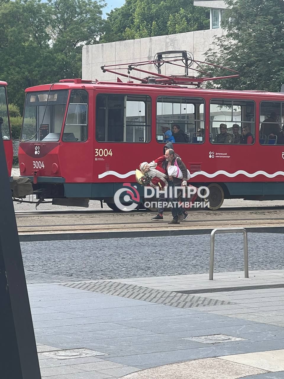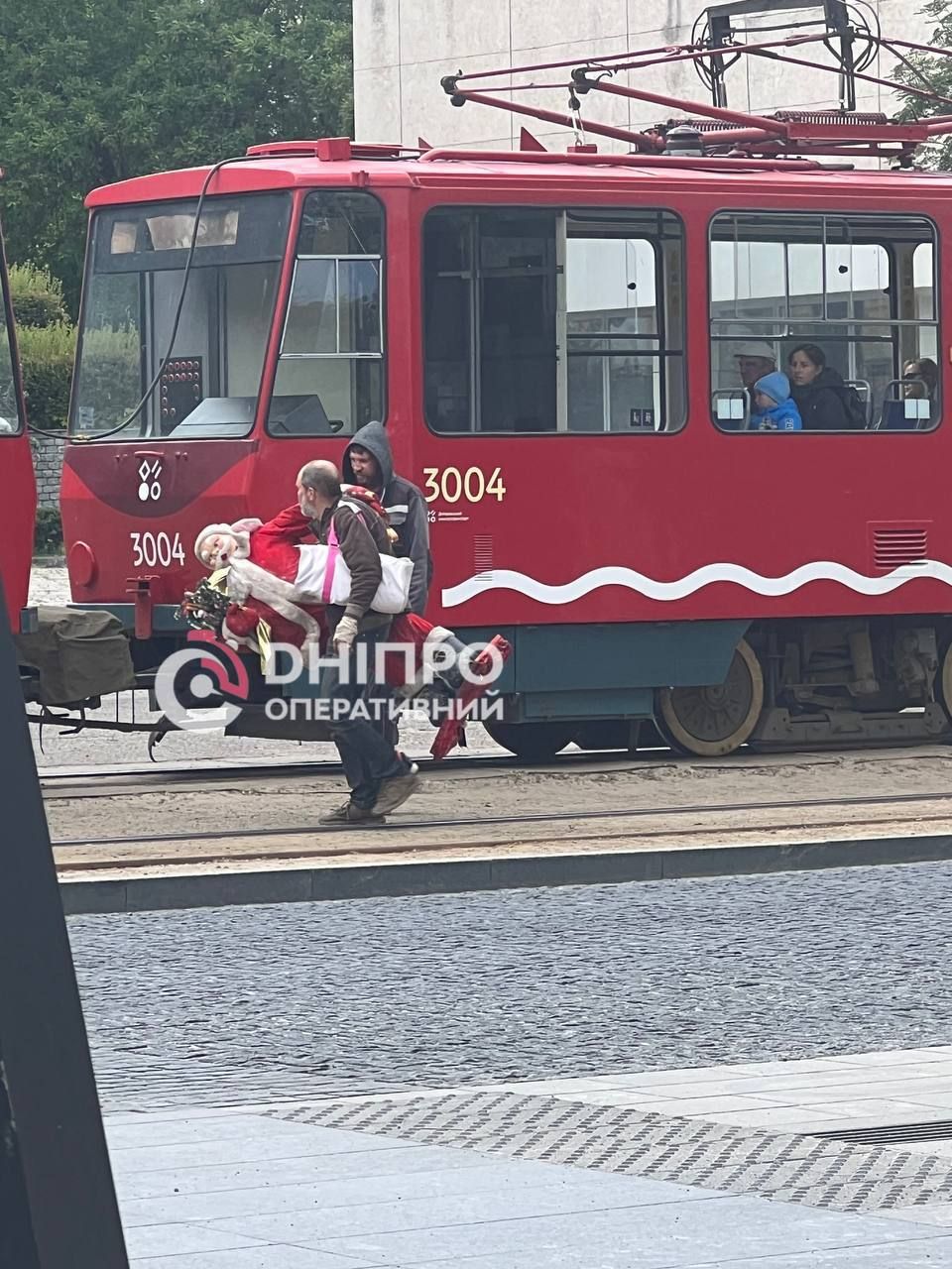 У Дніпрі біля трамвайної зупинки поблизу парку Шевченка помітили двох чоловіків, які несли з собою скульптуру Санта Клауса. Містян здивувала поява головного героя зимових свят посеред травня.