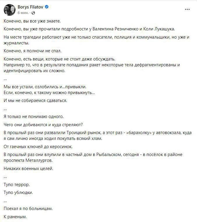Крім того, Філатов зазначив, що минулого разу росіяни розвалили Троїцький ринок, а зараз "барахолку" біля автовокзалу та приватний сектор в районі проспекту Металургів. За словами міського голови, там не було ніяких військових цілей, тому це терор мирного населення.