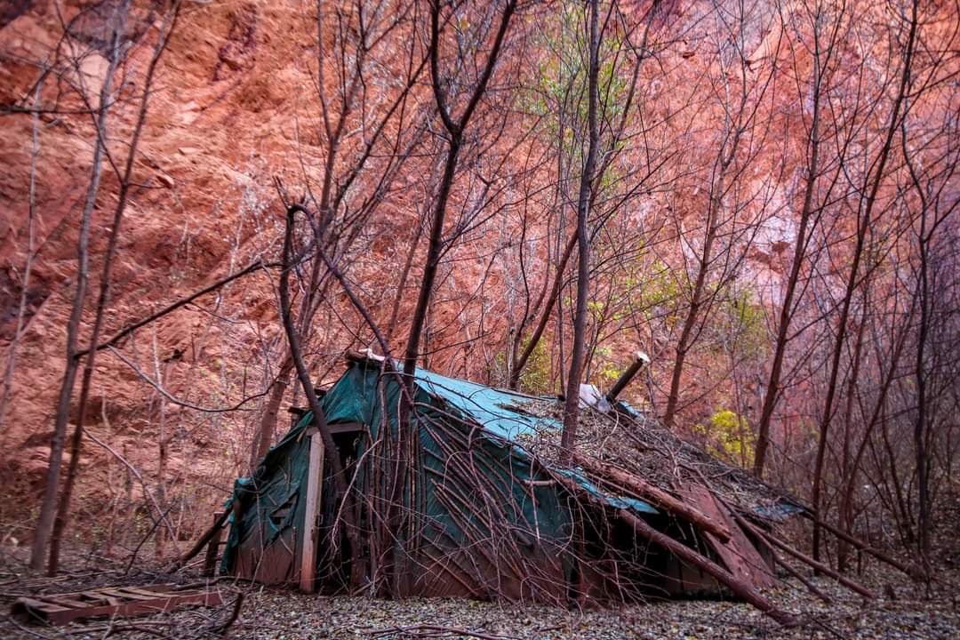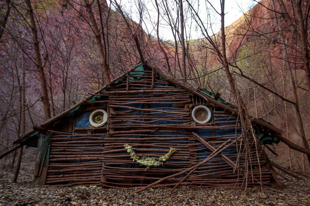 Споруду розмістити внизу провалля за гілками. Напевне, хтось хотів сховатися тут від решти світу. Видніється лише дах хатинки, тому можливо основна частина будівлі знаходиться під землею.
