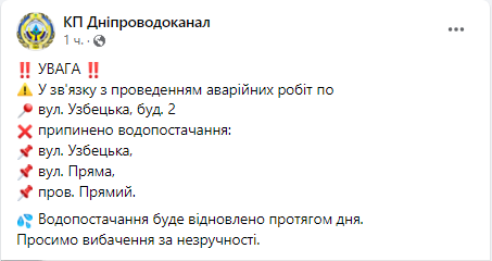 Так, у зв'язку із проведенням аварійних робіт на вул. Узбецькій, 2 припинено водопостачання: