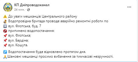 Сьогодні, 11 листопада, деякі мешканці Дніпра залишилися без води.