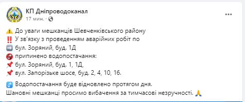 Аварійні роботи: де сьогодні у Дніпрі немає води